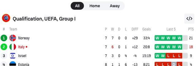本场比赛过后,意大利依旧落后挪威3分排名第二,最后一轮意大利将正面对决挪威,但意大利比挪威少17个净胜球,意大利需要净胜挪威18球,才可以头名晋级,否则将参加附加赛。