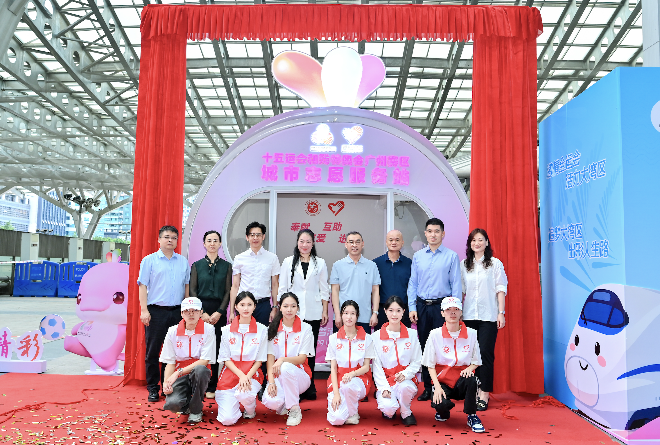 与会嘉宾共同为“广州东站交通枢纽志愿服务站”揭幕,标志着天河区50个城市志愿服务站全面投入运营。