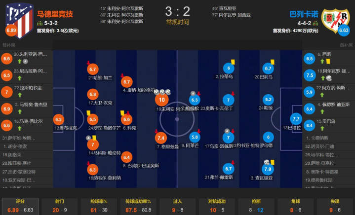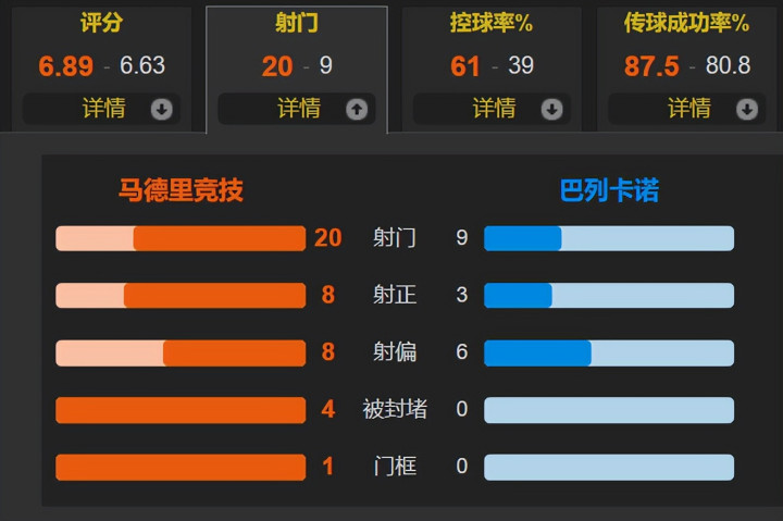 全场比赛利创智投,马竞的控球率为61%,一共有20次射门,其中8次射正;巴列卡诺一共有9次射门,其中3次射正。
