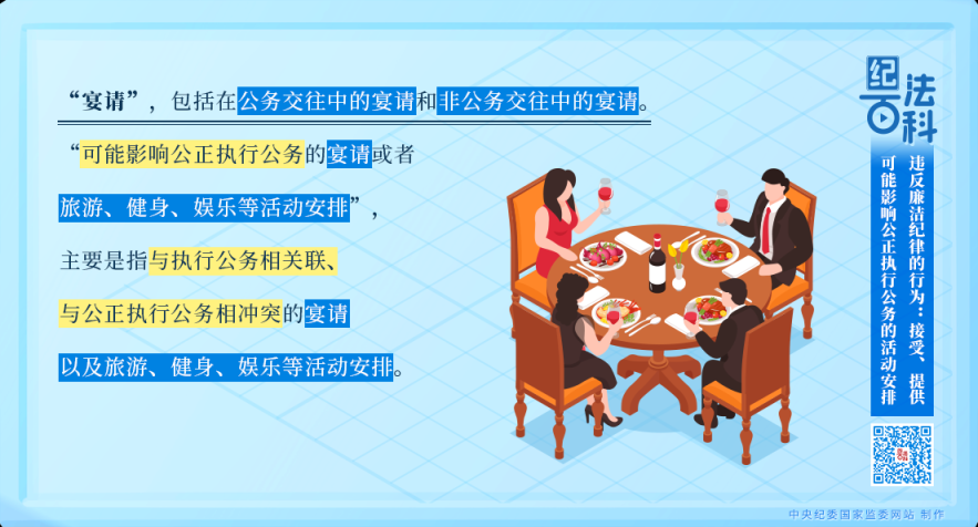 “宴请”,包括在公务交往中的宴请和非公务交往中的宴请。“可能影响公正执行公务的宴请或者旅游、健身、娱乐等活动安排”,主要是指与执行公务相关联、与公正执行公务相冲突的宴请以及旅游、健身、娱乐等活动安排。接受这些活动安排,就有可能影响公正执行公务。这种“可能”,不以接受安排者的主观意愿为依据,而应由党组织根据客观情况分析判断。比如,下级有求于上级时对上级的宴请,接受私营企业主、下属等管理和服务对象的宴请,工作对象对有关部门人员提供的旅游热丰网,受监督管理的一方对实施监督管理的一方提供的健身活动,下级单位为了获取政治、经济利益对上级领导部门工作人员提供的娱乐等活动,无论是什么标准,无论花费的是否是公款,只要是可能影响公正执行公务的活动安排,就一概不能接受。
